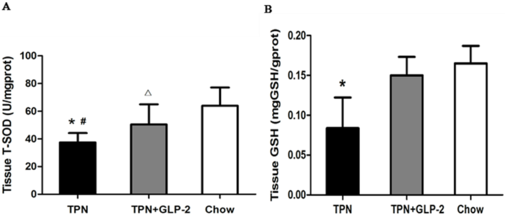 Tissue T-SOD activity and GSH level expression in mice given TPN, TPN + GLP-2 or chow for five days (mean ± SD). (A) T-SOD expression, * p < 0.05 vs. TPN + GLP-2, # p < 0.001 vs. control, ∆ p < 0.05 vs. control; (B) GSH expression, * p < 0.001 vs. TPN + GLP-2 and control. Prot: protein.