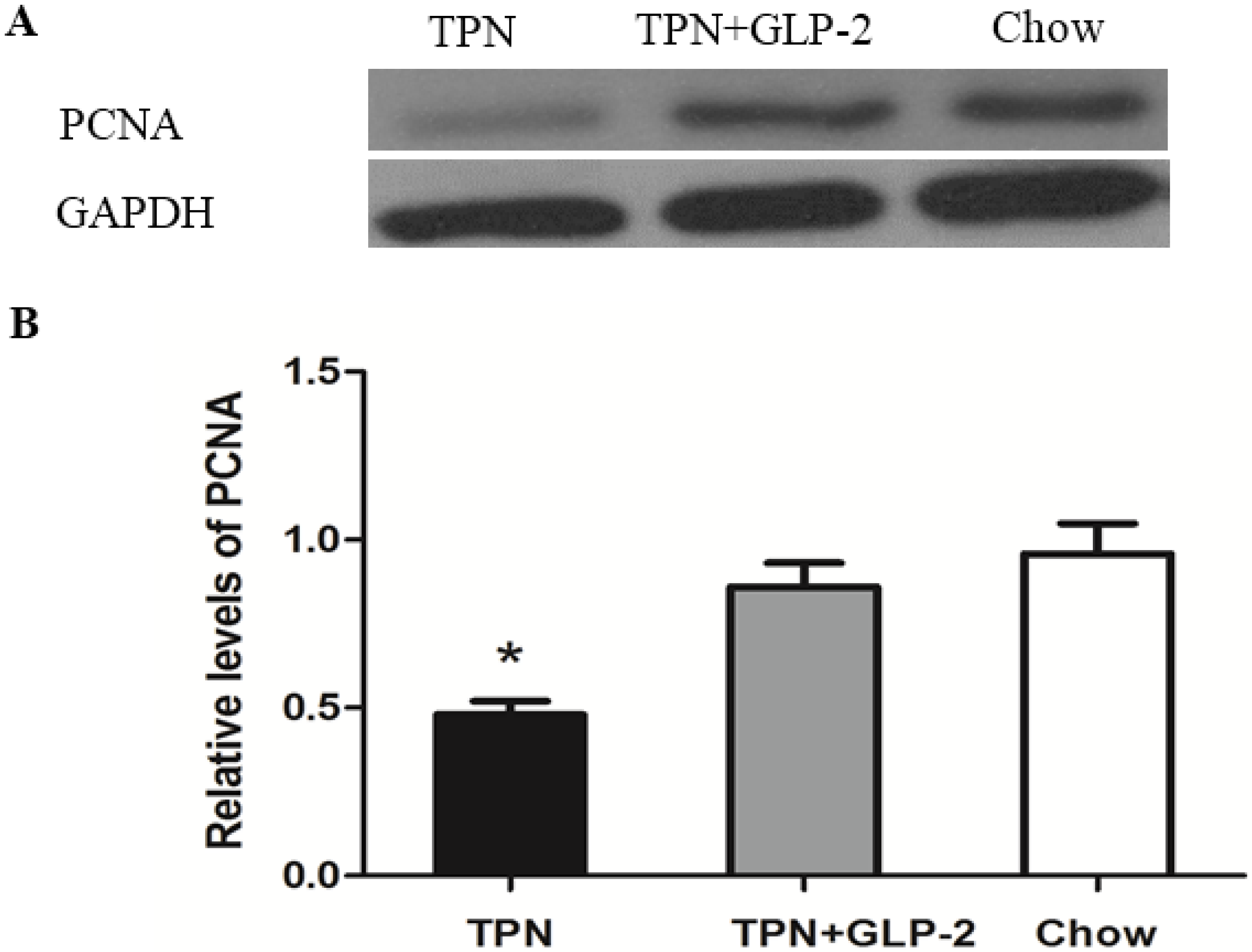 Western blot of the PCNA protein in ileum tissues. (A) Representative western blot results; (B) Relative density analysis of PCNA protein, * p < 0.05 vs. TPN + GLP-2 and control.