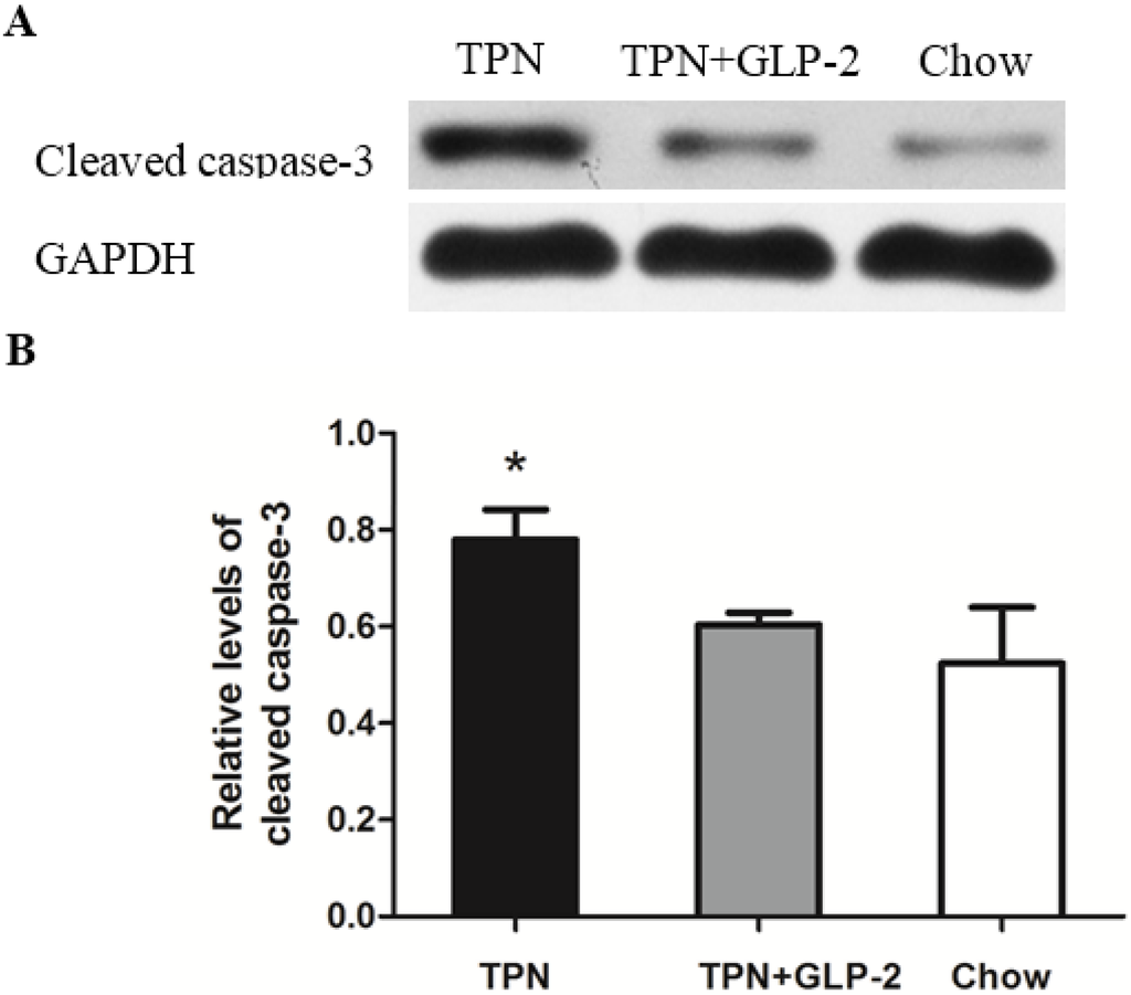 Western blot of the cleaved caspase-3 protein in ileum tissues. (A) Representative western blot results; (B) Relative density analysis of cleaved caspase-3 protein, * p < 0.05 vs. TPN + GLP-2 and control.