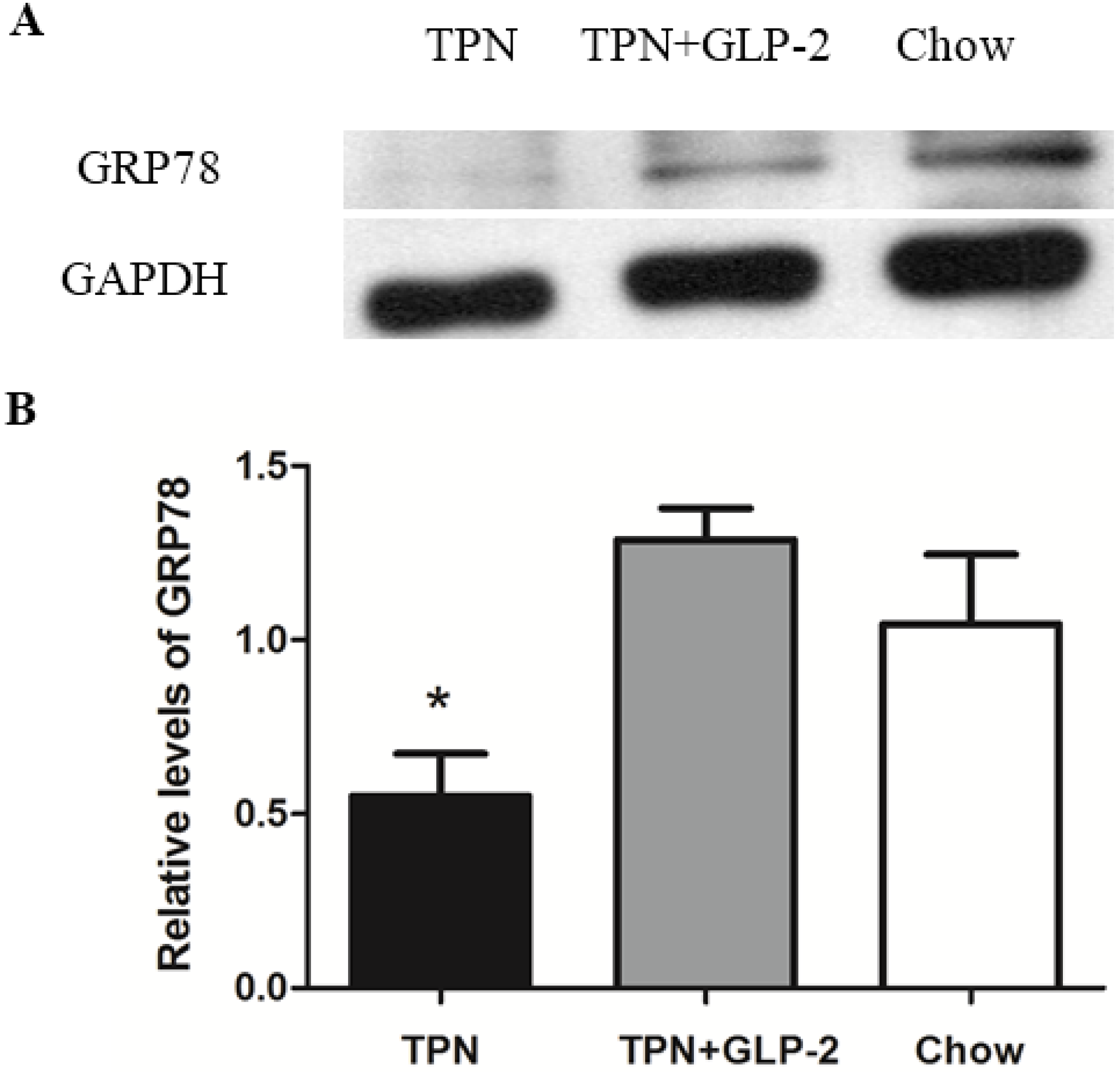 Western blot of the GRP78 protein in ileum tissues. (A) Representative western blot results; (B) Relative density analysis of GRP78 protein, * p < 0.05 vs. TPN + GLP-2 and control.
