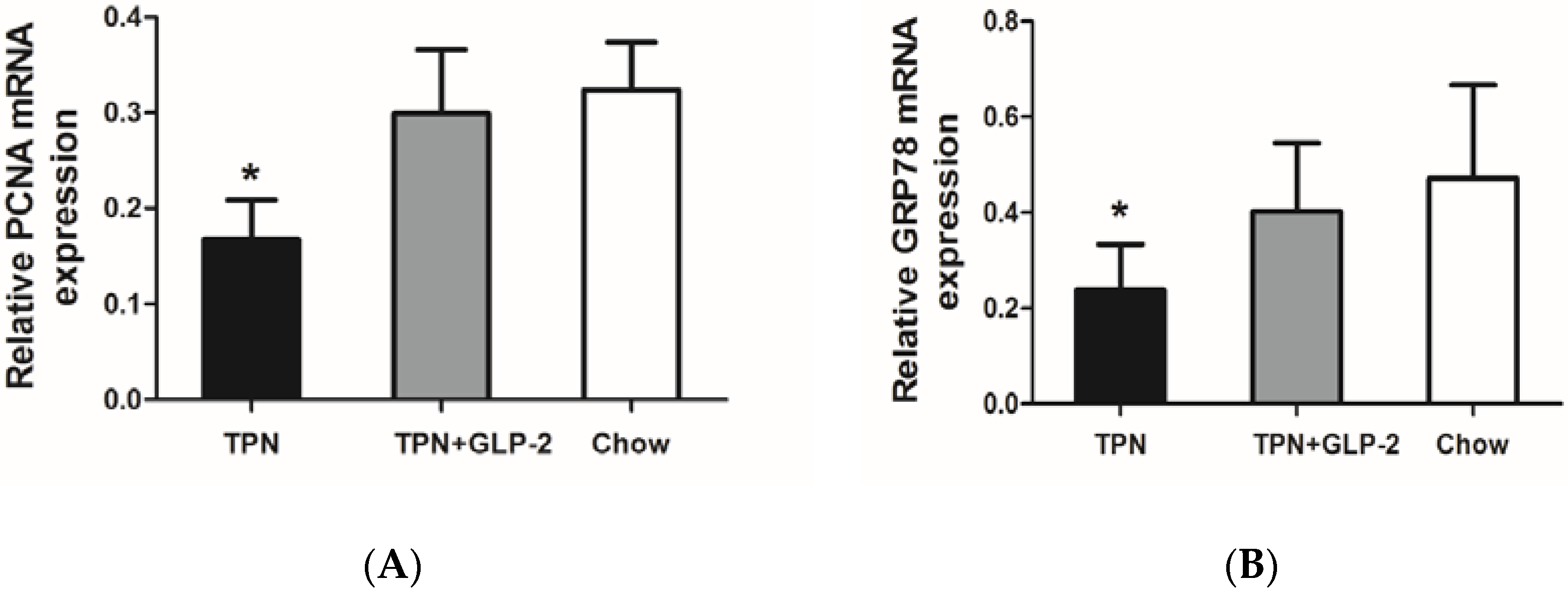 Effect of TPN, TPN + GLP-2 and control on mRNA expression. (A) Effects on PCNA mRNA, * p < 0.001 vs. TPN + GLP-2 and control; (B) Effects on GRP78 mRNA, * p < 0.05 vs. TPN + GLP-2 and control.