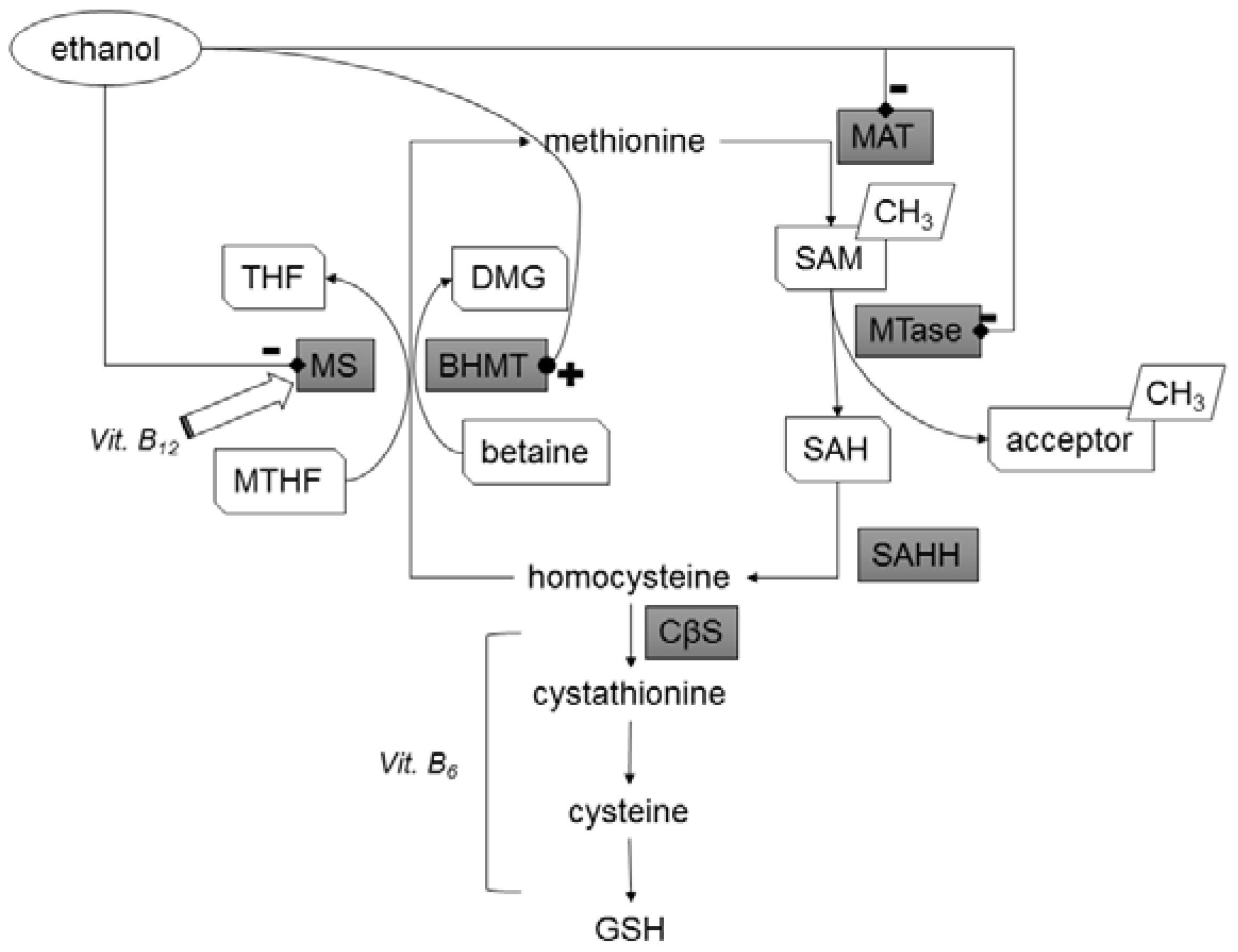 9]. Due to the inhibition of methionine synthase, the BHMT pathway becomes more important as a source of SAM and a determinant of Hcy in alcohol consumers [