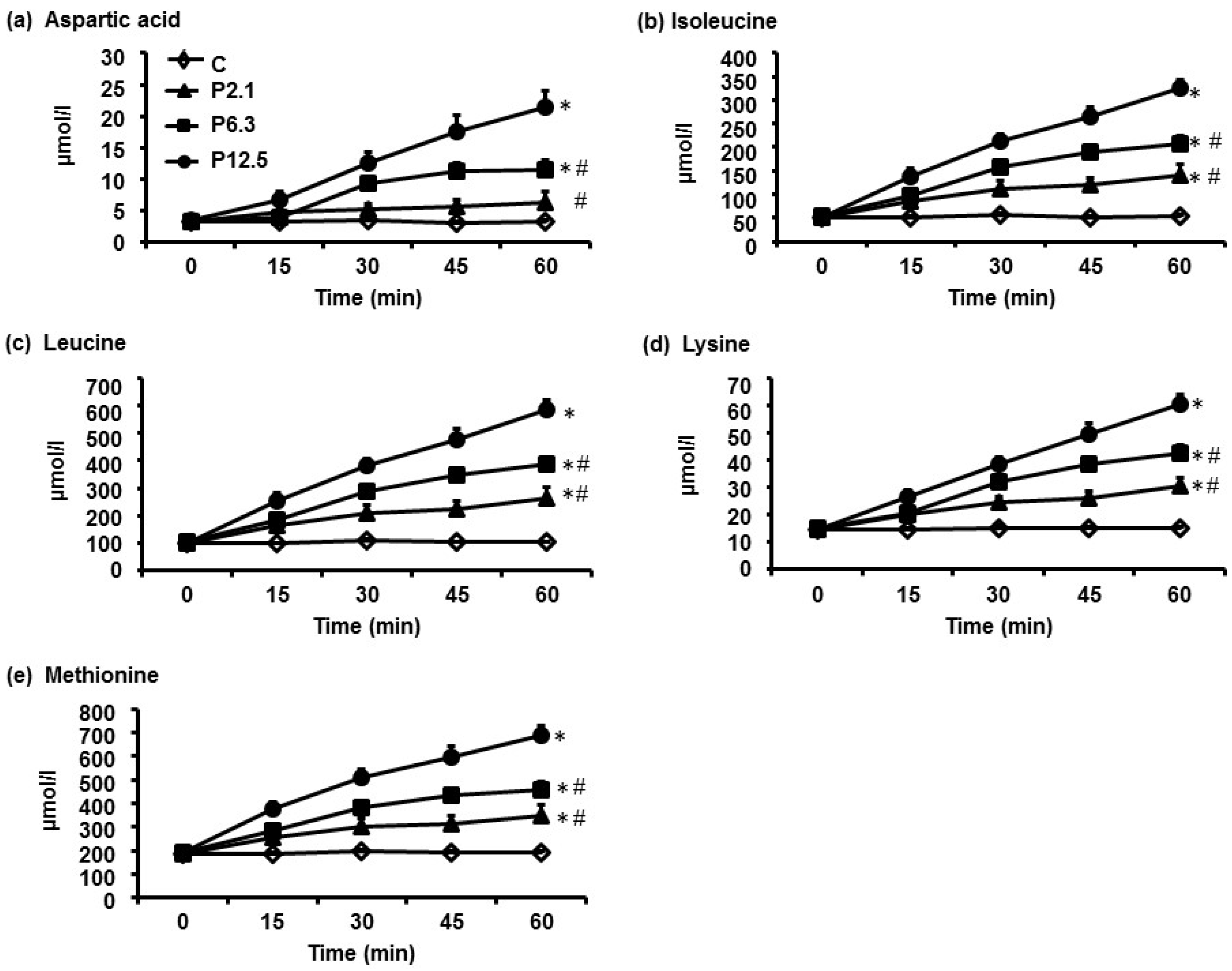 The temporal profiles of (a) aspartic acid; (b) isoleucine; (c) leucine; (d) lysine; and (e) methionine, the five amino acids whose plasma concentrations increased the most in response to increasing loads of ID protein. Data are means ± SEM, n = 16. The infusions consisted of either saline (C), or of 2.1 kJ/min (P2.1), 6.5 kJ/min (P6.3), or 12.5 kJ/min (P12.5) of hydrolysed whey protein, each infused at 4 mL/min for 60 min. Main effect of protein load was determined by one-way ANOVA and post-hoc comparisons between two loads were done using Bonferroni’s correction; statistical significance was accepted at p < 0.05. * Significantly different from C. # Significantly different from P12.5 (p < 0.05).