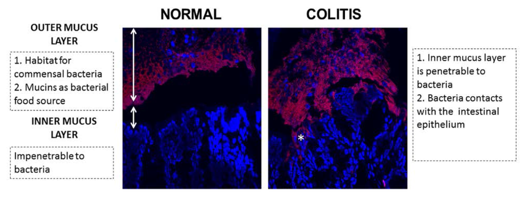 The primary defence against microbe and pathogen penetration of the lamina propria is the single layer of epithelial cells and its associated protective mucus layer. Increasing evidence suggests that an imbalanced mucus barrier may play an important role in the disease progression of IBD [3,4]. As the first anatomical site of the intestinal barrier, the mucus barrier forms a matrix preventing particles the size of bacteria from penetrating the epithelium. Additionally, as an important part of the innate immune system, the mucus barrier helps to maintain the immune mutualistic relationship between host and bacteria and to reduce the activation of subepithelial lymphocytes [5,6]. In addition, the well-accepted animal models for IBD, dextran sulfate sodium (DSS) induced mice and Il10−/− mice, reveal bacterial penetration into the inner mucus layer and epithelial crypt [5,7] (Figure 1), implying dysfunction in the mucus barrier in the exacerbation of IBD. Aberrations in the mucus barrier most likely reduce the ability of the intestinal barrier to cope with bacteria and may contribute to the susceptibility to developing colitis [8].