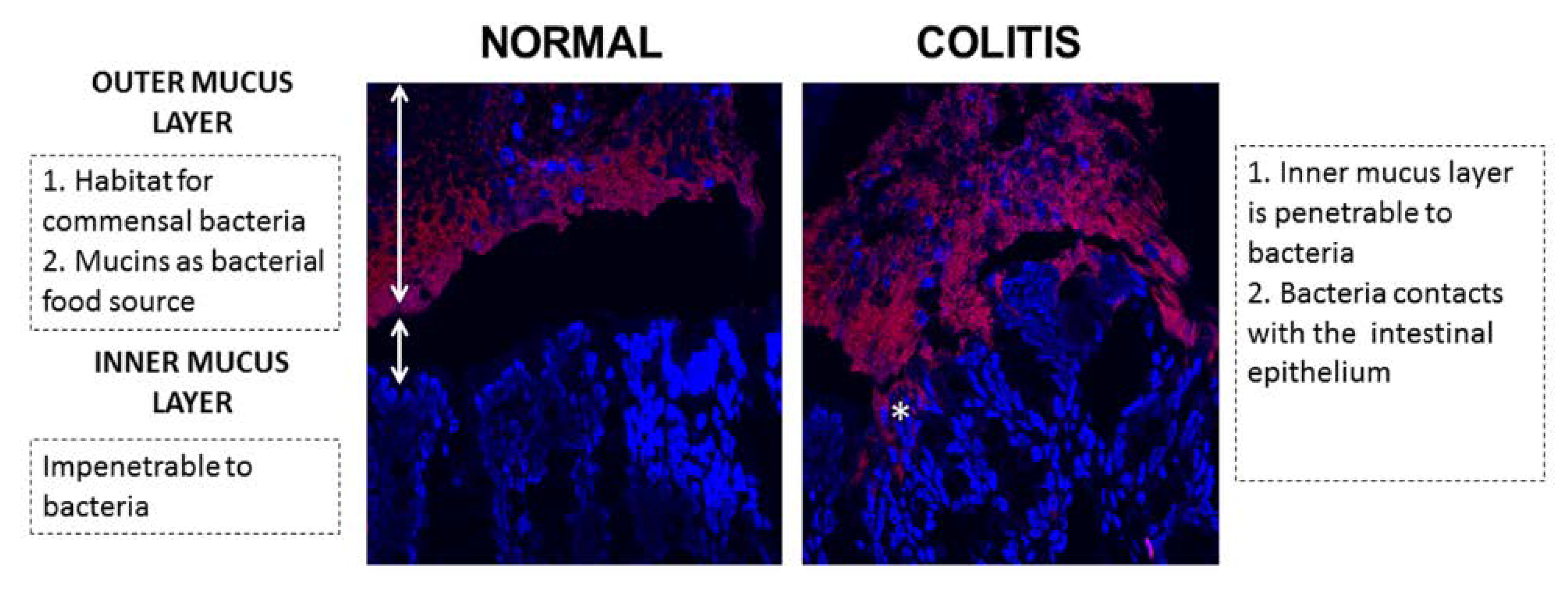 Fluorescence in situ hybridization result of normal and colitis colon mucus layers in mice. Red: bacteria; blue: epithelium cells; *: bacteria contacts with the intestinal epithelium.