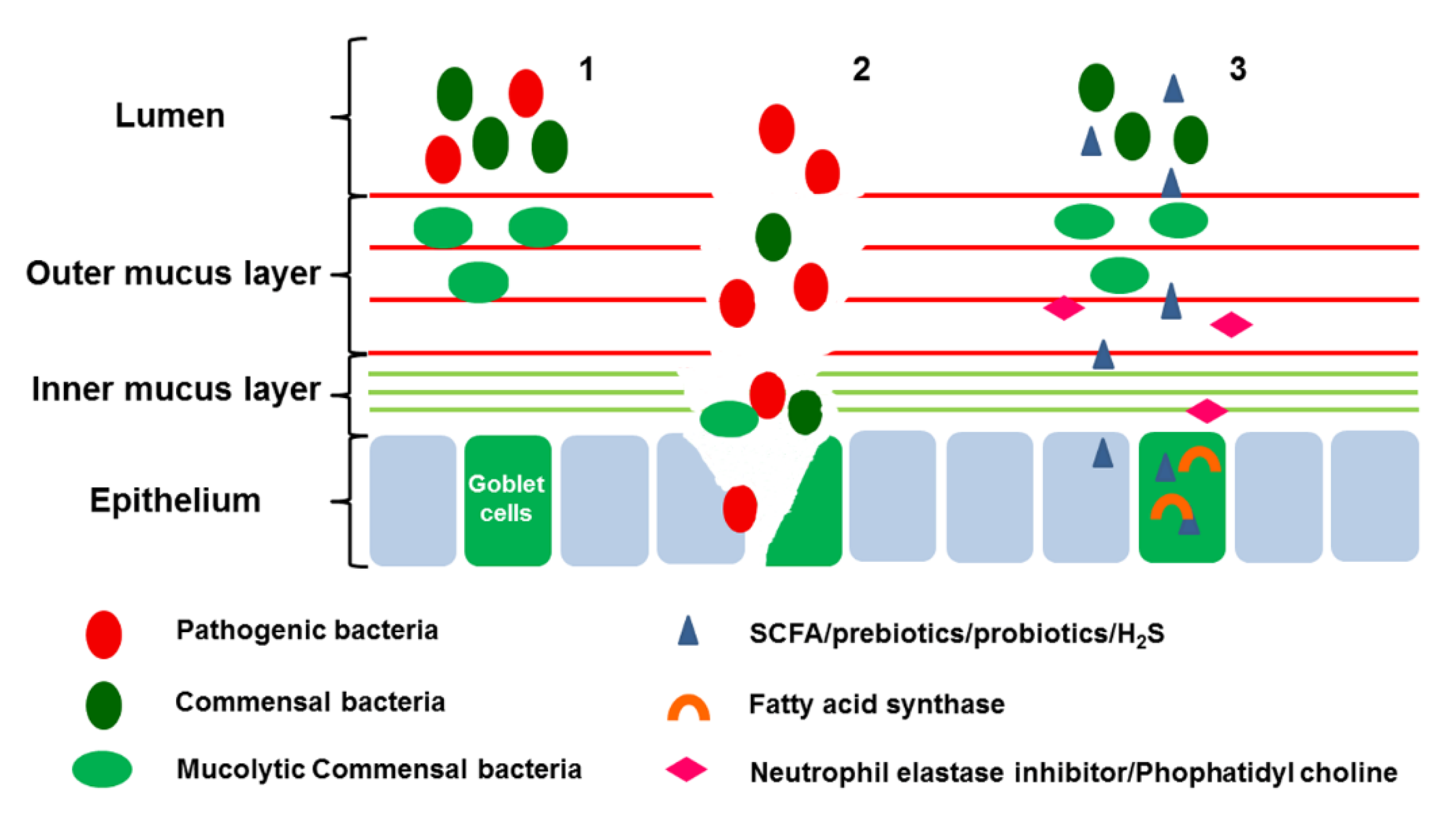 Therapeutic potential of modifying the mucus barrier. (1): Mucins can act as a barrier to both pathogenic and commensal bacteria. Some commensal bacteria are capable of binding to the mucus layer and in do so act as antagonists to the binding of pathogen; (2): When the mucus layer was destroyed, pathogenic bacteria penetrate the mucus layer and bind to the epithelium and exert a negative effect on the host cells; (3) Short-chain fatty acids (SCFA)/prebiotics/probiotics/H2S can modulate the bacteria, support nutrition to host cells, and promote the mucus secretion; Fatty acid synthase can also promote the expression of MUC2; Neutrophil elastase inhibitor/Phophatidyl choline can decrease the degradation of mucus layer.