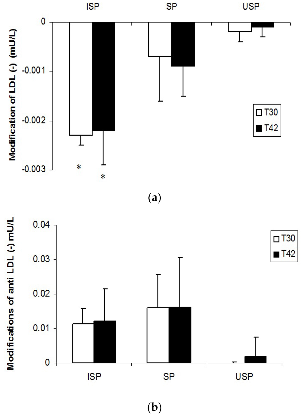 Electronegative low-density lipoproteins (LDL) (LDL (‒)) (a) and anti-LDL (‒) autoantibodies (b) after 30 and 42 days of study (changes from baseline). * Different from the baseline (p < 0.05). ISP Group: individuals who consumed the isoflavone-supplemented soy product; SP Group: individuals who consumed the soy product; USP Group: individuals who consumed the unfermented soy product (placebo). T0: baseline; T30: 30 days of daily consumption of soy products; T42: 42 days of daily consumption of soy products.