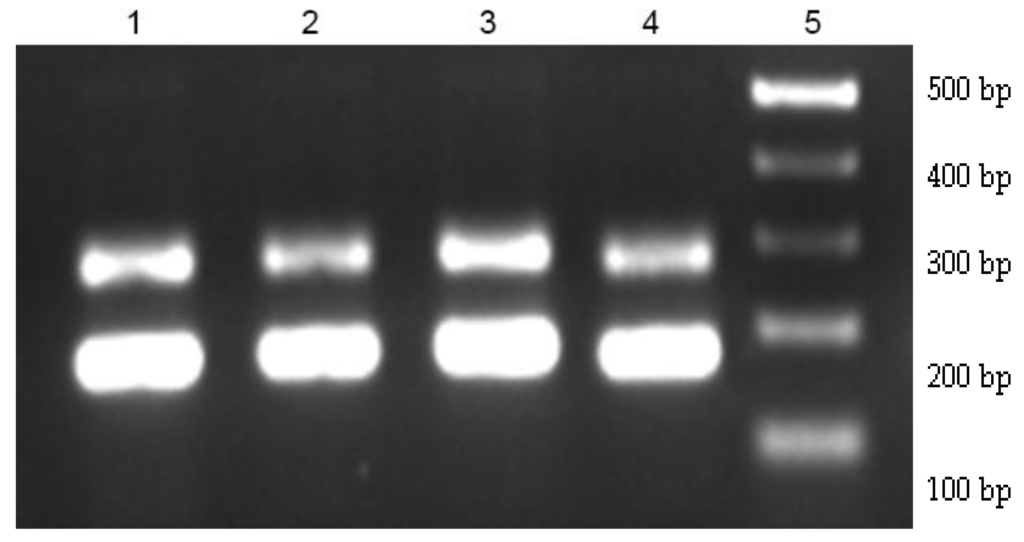 Agarose gel electrophoresis of Polymerase Chain Reaction (PCR) products obtained from colonies isolated from fecal samples after 42 days of intervention. 1—E. faecium from ISP; 2—E. faecium from SP; 3—E. faecium from USP; 4—E. faecium CRL 183 (pure strain); 5—1 kb DNA ladder.