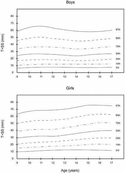 As can be observed, the smoothed LMS curves show higher values for triceps and subscapular skinfold thickness and T + SS for girls, regardless of age, in comparison with boys. These results are similar to those reported by Kromeyer-Hauschild et al. [18] for a population of 2132 boys and girls in the city of Jena (Germany). In this study, the girls in all age groups had the highest mean values for these skinfolds. In regard to the boys, the 50th percentile of the triceps and subscapular skinfold thickness and T + SS varied from 10.0 to 14.0 mm, from 10.0 to 15.0 mm, and from 23.0 to 28.0 mm, respectively. Among the girls, the 50th percentile for these same skinfold thicknesses ranged from 17.0 to 22.0 mm, from 12.0 to 21.0 mm, and from 28.0 to 42.0 mm, respectively.