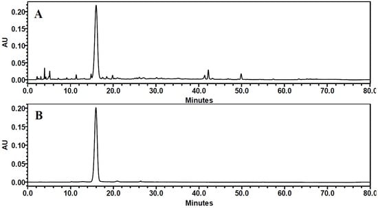 The purity of C3G was determined by HPLC (2695 pump, 2996 diode array detector; Waters Corp., Milford, MA, USA) coupled with a Waters SunFire C18 analytical column (4.6 × 250 mm) at a column temperature of 25 °C. The HPLC analyses were performed as per previously published procedures [29] with some modifications. The mobile phase consisted of 0.1% (v/v) formic acid in water (eluent A) and of acetonitrile: 0.1% formic acid (1:1, v/v) (eluent B). The gradient program was as follows: 0 to 40 min, 10% to 38% of B; 40 to 60 min, 38% to 48% of B; 60 to 70 min, 48% to 100% of B; 70 to 75 min, 100% to 10% of B; 75 to 80 min, 10% of B. Then 10 μL samples were injected and were detected from 200 to 600 nm. Anthocyanins were calculated as C3G equivalent at 515 nm.