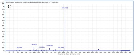 Further identification of C3G was confirmed by LC-MS (Figure 1C) and 1H-NMR (Table 2). Among all the LC-MS2 products, ions at m/z 287.0 were present in great abundance which was related to the loss of one hexose ([M − 162]+) molecule, furnishing the cyanidin aglycone, the main body structure of C3G. The ions at m/z 136.9 and 240.6 resulted from the ring-cross cleavage of cyanidin. The 1H-NMR spectrum showed the presence of one cyaniding nucleus and one hexose (Table 2).