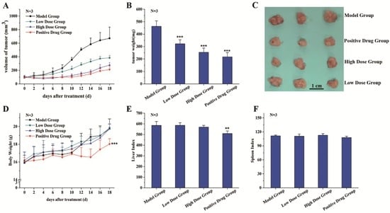 Effects of purified C3G on tumorigenesis in vivo. (A) The volumes of tumors were monitored at the indicated times; (B) tumor weights were measured after rats were sacrificed; (C) photographs of individual tumor xenografts removed from mice; (D) the body weights were monitored every alternate day after treatments; (E) the liver index and (F) the spleen index. The index was calculated as liver weight (mg)/body weight (g); and spleen weight (mg)/body weight (g), respectively. Values are mean ± SEM of three mice. ** p < 0.01, *** p < 0.001.