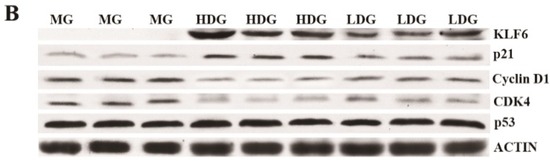 Tumor tissues were lysed using RIPA buffer containing 1% PMSF (Phenylmethanesulfonyl Fluoride), and protein inhibitor (cOmplete mini, Roche, Los Angeles, CA, USA). The protein concentration was determined using the Pierce BCA Protein Assay Kit (Thermo Scientific, Waltham, MA, USA). The concentration was adjusted to 1 μg/μL using PBS and 5× loading buffer. Equal amounts (40 μg) of protein were separated on a 10% SDS (Sodium Dodecyl Sulfate)-polyacrylamide gel and transferred onto PVDF (Polyvinylidene Fluoride) membranes. After blocking the membrane with 5% nonfat dried milk for 1.5 h, the protein abundance was detected with antibodies against KLF6 (1:1000 dilutions), p21 (1:1000 dilutions), p53 (1:1000 dilutions), Cyclin D1 (1:1000 dilutions), CDK4.