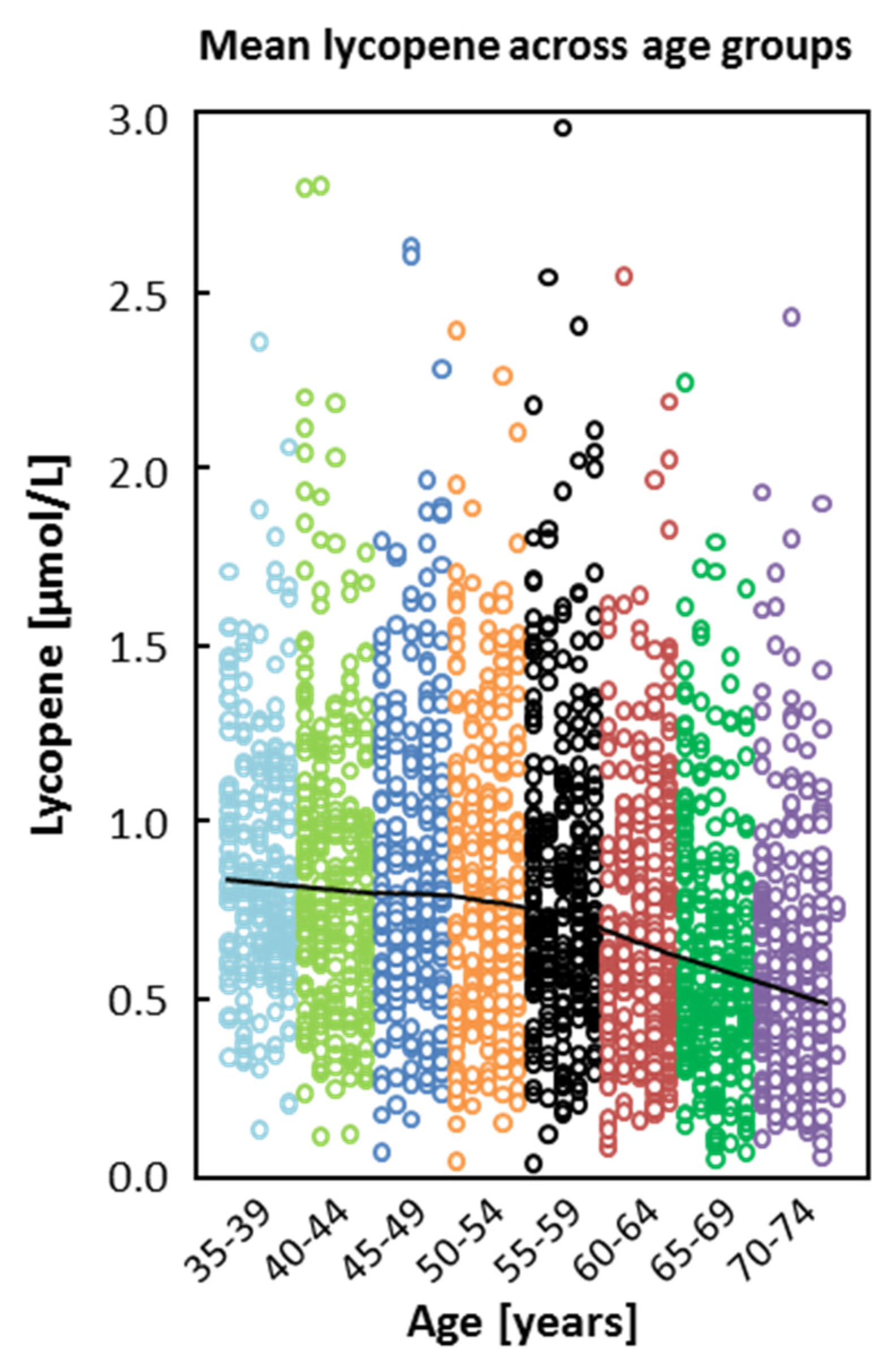 Mean lycopene across age groups. The black line indicates the mean plasma concentration of lycopene in the different age groups (n = 2118).