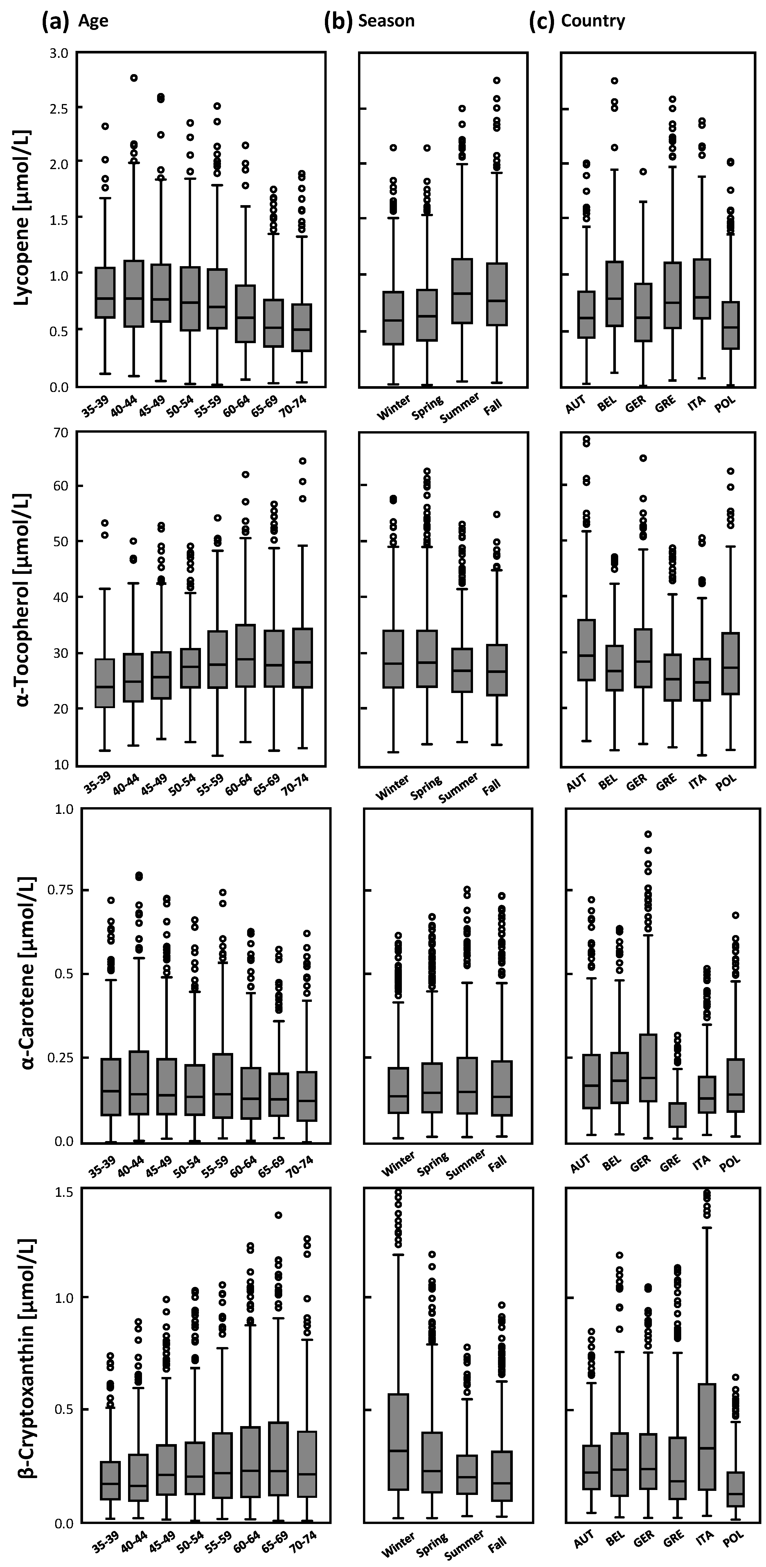 Micronutrient concentrations by age, season, and country. Box-plots of plasma lycopene, α-tocopherol, α-carotene, and β-cryptoxanthin by (a) age in five-year age groups; (b) season; and (c) country (AUT, Austria; BEL, Belgium; GER, Germany; GRE, Greece; ITA, Italy; POL, Poland). Extreme values are included in analyses but not shown in the figure.