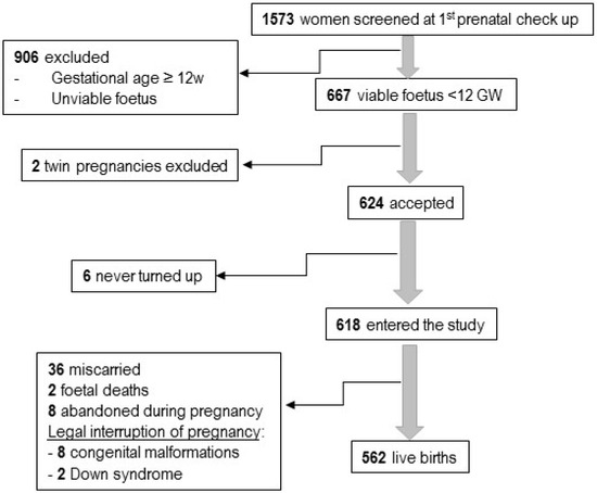 Participation in the study by eligible candidates and completion (defined as live birth) is illustrated in Figure 1. Of the women screened at their first prenatal check-up, 42.4% were eligible to participate in the study. Of the 624 participants that entered the study (93.8% of those eligible) first trimester data was collected from 612 and 562 went on to have live births.