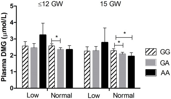 A stratified analysis of plasma dimethylglycine for each genotype according to plasma folate status in early pregnancy is illustrated in Figure 2. In the normal-high category of plasma folate status, lower plasma dimethylglycine was observed in the heterozygote compared to the homozygote common genotype at both ≤12 and 15 GW and in the homozygote variant compared to homozygote common genotype at 15 GW.