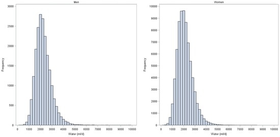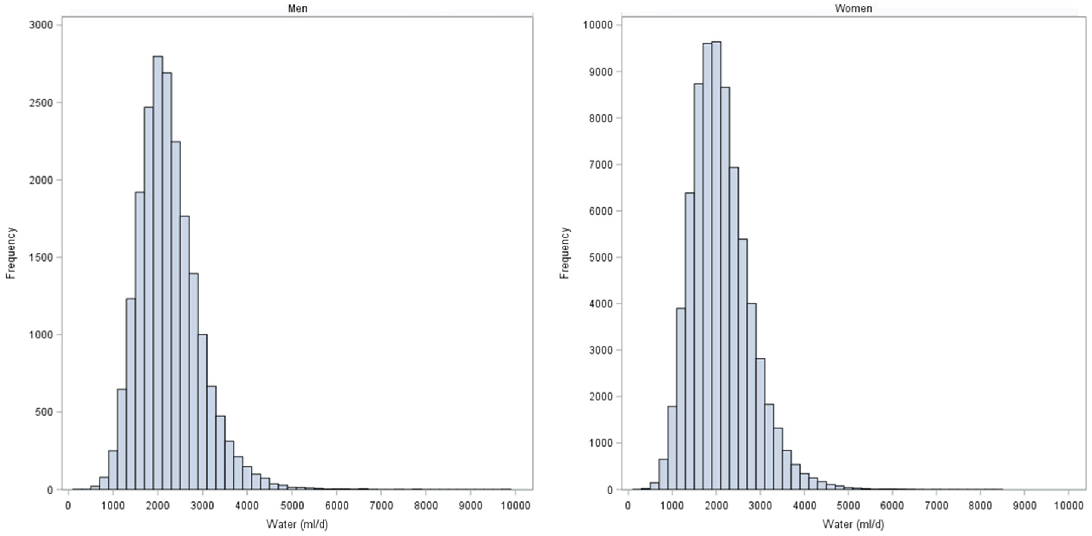 The distribution of mean total water intake (TWI) (g/day), stratified by sex is shown Figure 1. The mean TWI was 2.3 L for men and 2.1 L for women, close to the EFSA “adequate intake” (AI) recommendations for adults: 2.5 L and 2 L, respectively, though lower for men and higher for women.