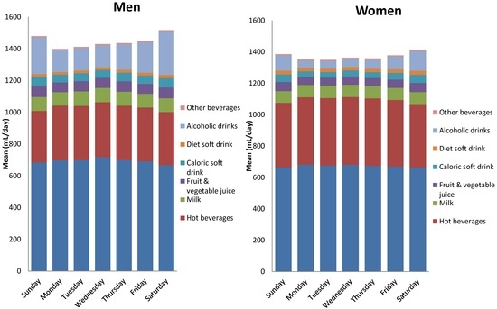 In order to estimate the effect of the season on beverage consumption, nutritional data were separated according to the month of the 24 h-records: December–January–February (winter), March–April–May (spring), June–July–August (summer) and September–October–November (autumn). Beverage consumptions were also calculated separately for each day of the week in order to test whether there was a trend over a week. For this calculation, no weighting on the type of day (week or weekend day) was performed.