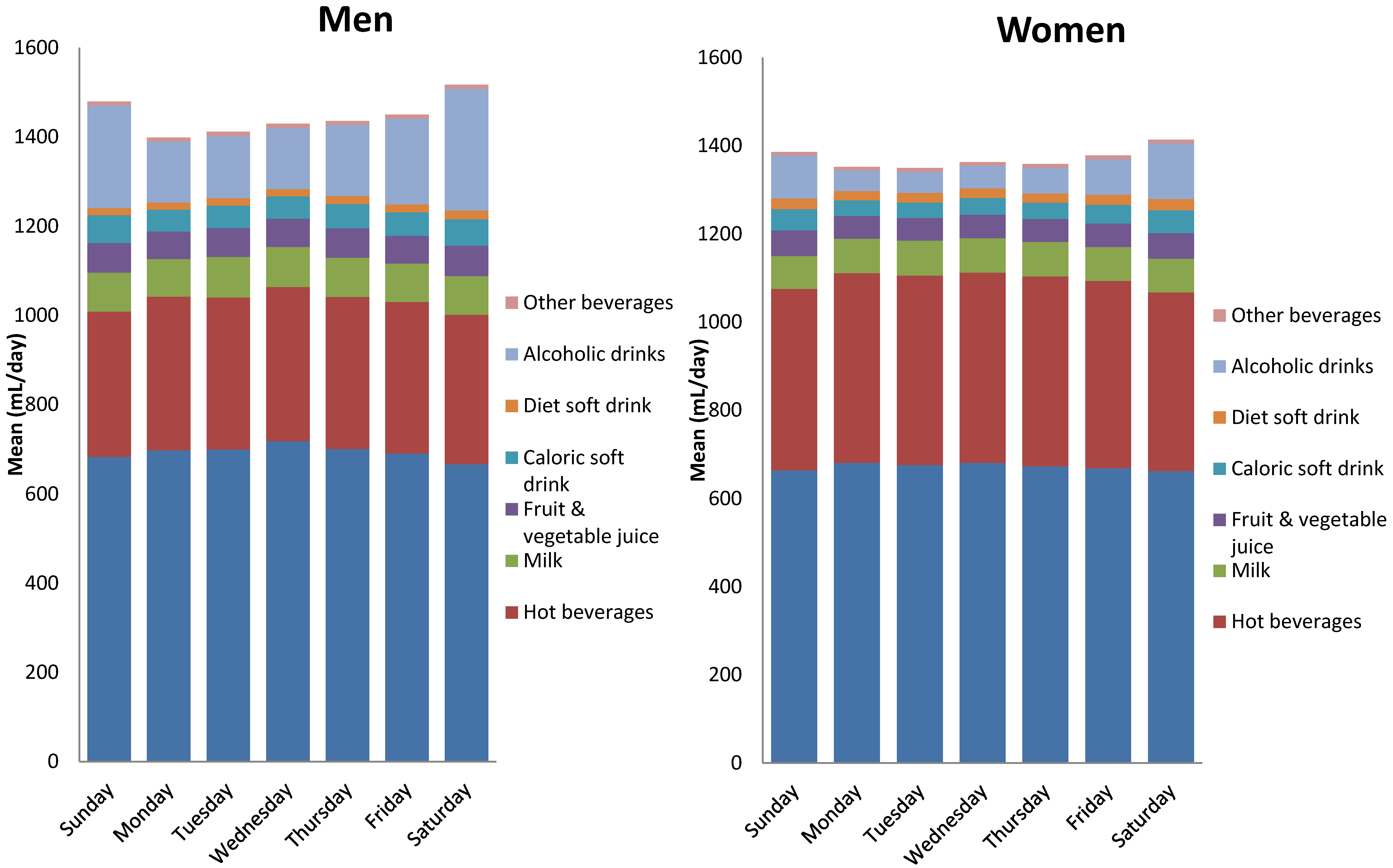 The total amount of beverage intake (mL) was higher on Saturdays and on Sundays compared to other days of the week (p < 0.0001). There is a higher consumption of alcoholic drinks at weekends (p < 0.0001). Both men and women consumed around two times more alcoholic drinks on Saturdays than on a week day. Weekends were also associated with a lower consumption of water and hot beverages, and a higher consumption of caloric soft drink (p < 0.0001).