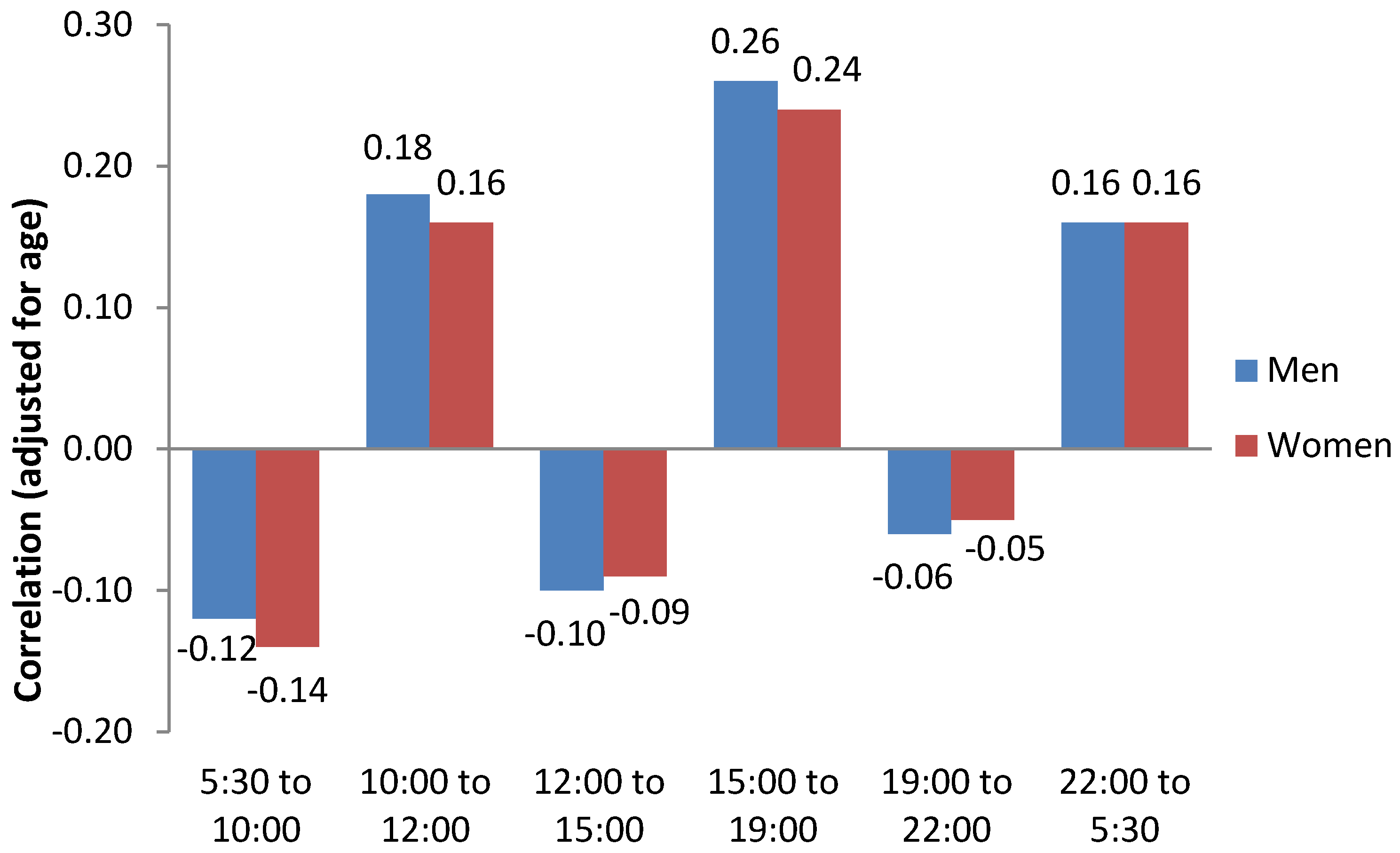Partial correlations between TWI and beverage consumption in each period, by gender, adjusted for age. Beverage consumption in each period expressed as a percentage of total consumption over 24 h.