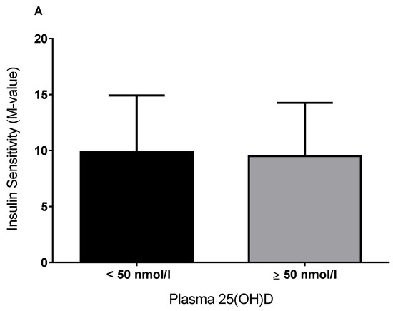 Insulin sensitivity (M-value; A), as measured by hyperinsulinemic-euglycemic clamp, stratified by deficient/insufficient and replete vitamin D status.