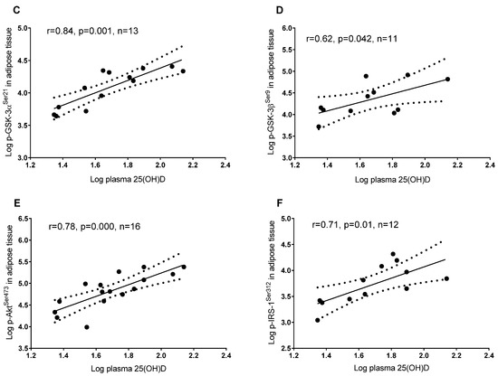 Linear regression between plasma vitamin D (25(OH)D) and insulin signaling proteins in adipose tissue and skeletal muscle: (A) Plasma 25(OH)D and phosphorylation of GSK-3 αSer21 in skeletal muscle; (B) Plasma 25(OH)D and phosphorylation of GSK-3 βSer9 in skeletal muscle; (C) Plasma 25(OH)D and phosphorylation of GSK-3 αSer21 in adipose tissue; (D) Plasma 25(OH)D and phosphorylation of GSK-3 βSer9 in adipose tissue; (E) Plasma 25(OH)D and phosphorylation of AktSer473 in adipose tissue; (F) Plasma 25(OH)D and phosphorylation of IRS-1Ser312 in adipose tissue.
