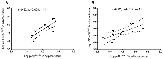 Linear regression between: (A) Phosphorylated AktSer473 and phosphorylation of GSK-3 αSer21 in adipose tissue; (B) Phosphorylated AktSer473 and GSK-3 βSer9 in adipose tissue.