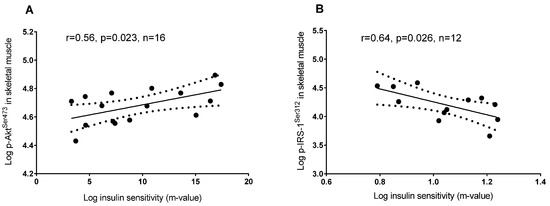 Insulin sensitivity was not associated with phosphorylation of GSK-3 αSer21 and βSer9 in skeletal muscle (p = 0.83 and p = 0.92, respectively; data not shown) or adipose tissue (p = 0.28 and p = 0.42, respectively; data not shown). On the other hand, insulin sensitivity was associated with higher phosphorylation of AktSer473 and lower phosphorylation of IRS-1Ser312 in skeletal muscle (Figure 4), but not in adipose tissue (p = 0.96 and p = 0.23, respectively; data not shown).