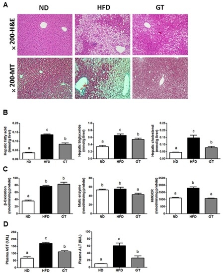 The morphology of hepatic tissue revealed a decrease in the accumulation of hepatic lipid droplets in the GT group. MT staining of the liver also demonstrated no fibrotic changes in the ND and GT groups, whereas fibrosis was observed around the vessels in the HFD group (Figure 7A). Hepatic fatty acids, triglyceride, and cholesterol contents of the GT group were significantly lower when compared to the HFD group (Figure 7B). Although there was no significant difference in the activity of β-oxidation between GT and HFD groups, the activities of HMG-CoA reductase (HMGCR) and malic enzyme were markedly reduced in the GT group relative to the HFD group (Figure 7C). Furthermore, the levels of plasma aspartate aminotransferase (AST) and alanine aminotransferase (ALT), markers of hepatic toxicity, were significantly decreased by GT supplementation (Figure 7D).