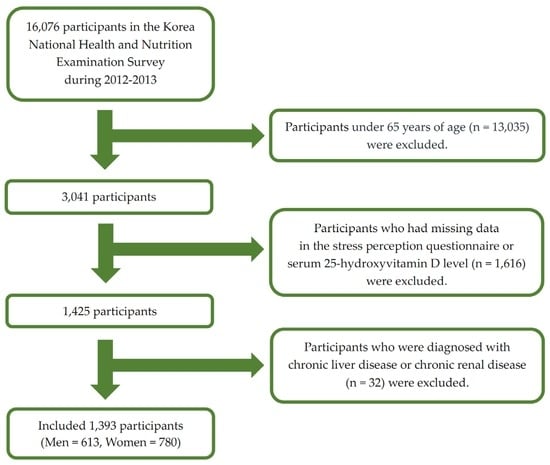 This nationwide cross-sectional study was based on data from the KNHANES V-VI conducted from 2012 to 2013. The KNHANES was a nationwide survey conducted by the Ministry of Health and Welfare. The KNHANES consisted of three components including a health interview, health examination, and a nutrition survey. A nationally representative sample was selected from the Korean population using household records developed by the 2005 Population and Housing Census in Korea. Twenty households from each district were selected using a stratified, multistage probability cluster sampling system that considers the geographical area, age, and sex of each participant. In the KNHANES V (2012) and VI (2013), 16,076 individuals participated in the examination. In the present study, we included the elderly population (those aged ≥65 years) (Figure 1) with data for important analytic variables such as serum 25(OH)D levels and the stress perception questionnaire. We excluded those diagnosed with liver cirrhosis and chronic renal diseases to eliminate factors affecting 25(OH)D deficiency. Ultimately, 1393 participants were included in the statistical analysis. The institutional review board of the Centers for Disease Control and Prevention in Korea approved the KNHANES. All participants in the survey provided written informed consent (2012-01EXP-01-2C, 2013-07CON-03-4C).