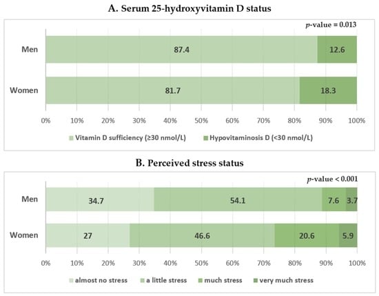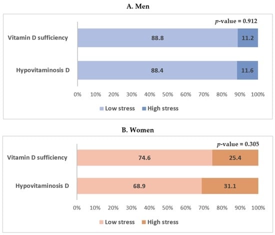 The current analysis was stratified by men and women to examine the interaction between sex and hypovitaminosis D because mean vitamin D concentrations and the prevalence of hypovitaminosis D were significantly different between men and women. Sex differences in the relationship between hypovitaminosis D and stress perception could be attributable to different factors. One explanation for the non-significant association between hypovitaminosis D and stress perception in men could be the small number of men with hypovitaminosis D. Nashold et al. (2009) found that estradiol mediates the enhancement of CNS vitamin D3 receptor transcription and function [52]. Correale et al. (2010) identified a stronger immunomodulatory effect of vitamin D in women than in men, suggesting a synergy between vitamin D and estradiol, which upregulates growth hormone expression in the hippocampus by stress [53]. It could be hypothesized that a similar mechanism may be responsible for the relationship between hypovitaminosis D and perception of stress in women. Women tend to use products for protection against sunlight (i.e., sun exposure-blocking clothing, sunblock creams, sunglasses, and hats) more often than men, which may result in sex differences. In the present study, women were older than men. The hormonal status of older women could have induced a poor health status, including hypovitaminosis D. These factors should be considered as possible causes of hypovitaminosis D in women [54].