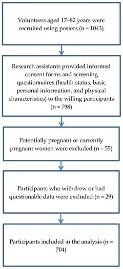 Healthy adults of Asian ethnicity with no recent history of alcohol consumption, tobacco use, or hospitalization were included (Figure 1). Subjects with one or more of the following conditions were excluded: hypertension, diabetes mellitus, cancer, renal failure, hepatitis-related diseases, chronic pulmonary diseases, pregnancy, or any artificial electrical implantation. In addition, persons with a disability, currently menstruating, administered hormones, with body shape abnormalities, and children were excluded.