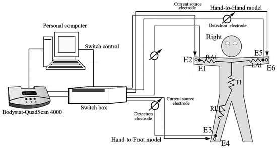 The Quadscan 4000 electrode wires were connected through a channel switch box controlled by the computer. The switch box was further connected to the E1, E3, and E5 stainless steel electrode measuring plate and E2, E4, and E6 stainless steel current electrode plates. An Omron HBF-361 (Omron Healthcare, Kyoto, Japan) platform was used as the impedance measuring base, and included handles, a stainless steel polar plate, and a cable. The electrical stainless steel area of the handle and base were 4 × 9 cm2 and 5 × 9 cm2, respectively. Further, we collaborated the direct measures from the stainless steel electrodes and circuit switch using the impedance collaborator provided by the Quadscan 4000 manufacturer. The impedance measures were 496–503 ohms, and no significant differences were found between the two methods.