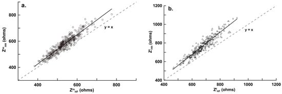 Correlations between ZHF (hand-to-foot impedance) with ZHH (hand-to-hand impedance) for (a) male subjects (n = 403; ZmHH = 1.119, ZmHF − 22.065, r = 0.938, SEE = 24.229 ohms, p < 0.001); and (b) female subjects (n = 301; ZfHH = 1.186, ZfHF − 33.970, r = 0.943, SEE = 34.021 ohms, p < 0.001). SEE, standard error of the estimate; r, coefficient of correlation.