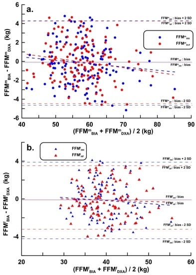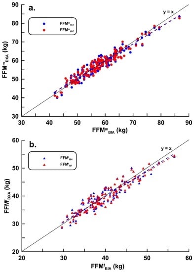 Estimated FFM Equations (1a), (1b), (2a) and (2b) were obtained using the modeling group data (men, n = 269; women, n = 201). Validation data (men, n = 134; women, n = 100) were substituted into the estimated equations, and the correlation coefficients, LOA, PE, and bias between FFMHH, FFMHF, and FFMDXA are shown in Table 3. The distribution and regression lines for male FFMmHH and FFMmHF and female FFMfHH, FFMfHF, and FFMDXA are shown in Figure 4a,b, with corresponding Bland–Altman analyses in Figure 5a,b.