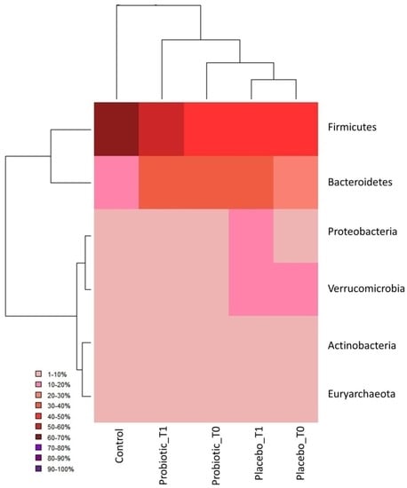 Massive sequencing revealed the presence of six phyla (five belonging to Bacteria and one to Archaea) with a relative abundance higher than 1%: Firmicutes, Bacteroidetes, Proteobacteria, Actinobacteria, Verrucomicrobia and Euryarchaeota. The obtained phyla had a different distribution among the five groups of examined subjects as highlighted in the heat map (Figure 2), in particular in the Firmicutes and Bacteroidetes phyla.