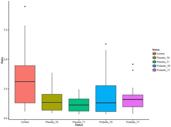 With regard to enterobacteria, they were more abundant in the control group compared to CD patients: 8.29 ± 0.80 and 7.10 ± 1.24 CFU/g, respectively. This trend can also be outlined from the graphs reported in Figure 10, which clearly shows that the median value of control group is higher than CD groups, the latter showing a lower level of enterobacteria with a higher heterogeneity. Furthermore, after the three months of probiotic treatment it was possible to observe a decreased level of enterobacteria in Probiotic T1 (Figure 10 and Table 3). Regarding Clostridium sensu stricto, its quantification was lower than the other microbial groups (values from 5.83 to 6.19 Log CFU/g of faeces). No statistical differences resulted from the comparison between control and CD patients and between Probiotic and Placebo groups.