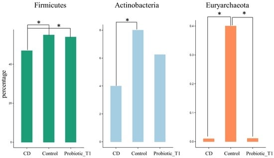 Relative abundance of the three phyla that show a statistical significance difference among CD, Control and Probiotic T1. CD group is composed of Probiotic T0, Placebo T0 and Placebo T1 samples. The * indicates p < 0.01. Supporting information on relative abundance and p-values is found in Tables S2 and S3.