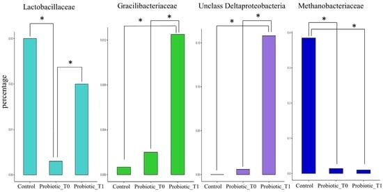 Statistical significant differences in families relative abundance among Control, Probiotic T0 and Probiotic T1 groups. The * indicates p < 0.01. Supporting information on relative abundance and p-values is found in Tables S6 and S7.