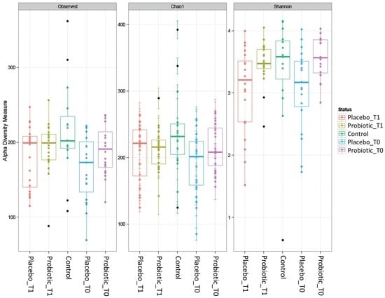 The sample subjected to sequencing belonged to the following groups: 20 Probiotic group T0, 20 Probiotic group T1, 20 Placebo group T0, 20 Placebo group T1 and 16 Control group (Figure 1).