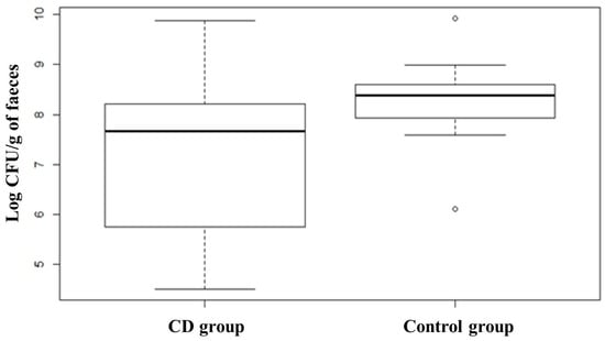 Quantification of Bifidobacterium spp. evidenced a slightly higher value in the subjects affected by CD at T0 with respect to the control group, although this difference was not significant. The comparison between subjects belonging to the probiotic group before and after the treatment showed that the administration of the probiotic formula containing Bifidobacterium breve led to a slight increase of bifidobacteria counts from 7.64 ± 1.01 to 8.06 ± 0.98 Log CFU/g of faeces. Lactobacillus spp. group analysis revealed that healthy subjects (Control group) had a higher presence of members of this group compared to CD patients, which on the contrary, showed a great heterogeneity in the distribution (Figure 8). ANOVA test revealed that the difference was statistically significant (p < 0.01). The opposite trend was found for members of Bacteroides fragilis group showing a higher median in CD subjects compared to healthy subjects, as shown in the box plot (Figure 9). The box plot relative to healthy subjects is shorter than the other one and it also shows a higher median value but a narrower distribution of the data. ANOVA test revealed that the difference is statistically significant (p < 0.01). CD patients showed more than 8.70 Log CFU/g of faeces of Bacteroides fragilis group bacteria. No significant differences were recorded concerning changes in the levels of Bacteroides due to treatment with probiotics.