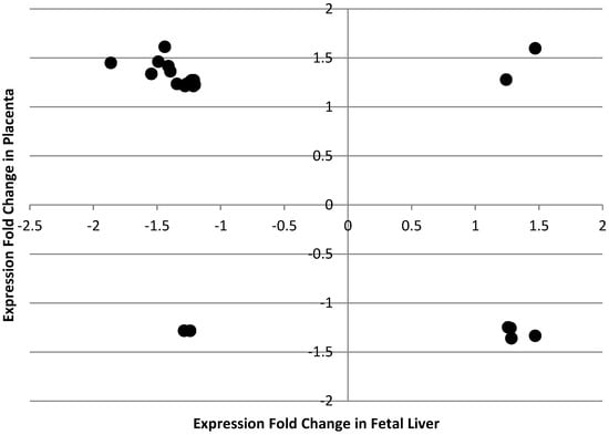 Scatterplot summarising the direction and level of fold change in expression of genes which were altered in both fetal liver and placenta by maternal folate depletion 1,2,3. 1 The Low and Normal folate diets contained 0.4 and 2.0 mg folic acid/kg diet respectively; 2 For each comparison, data were obtained from three male fetuses from each of six litters from dams fed either the Low or Normal folate diets; 3 A negative fold change indicates lower expression in offspring from dams fed the Low folate diet.