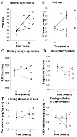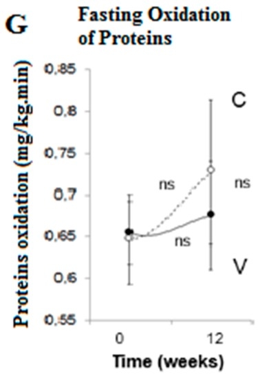 Data are presented as means with 95% confidence intervals. Maximal performance (Watt max) increased by 21% in vegetarian group (V) (F = 8.3, p < 0.001, partial η2 = 0.192), whereas it did not change in control group (C) (F = 1.0, p = 0.334; group × time F = 4.2, p = 0.048, partial η2 = 0.116; Figure 1A). Maximal oxygen consumption (VO2max) increased by 12% in V (F = 13.1, p < 0.001, partial η2 = 0.171), whereas it did not change significantly in C (F = 0.7, p = 0.667; group × time F = 9.3 p = 0.004, partial η2 = 0.209; Figure 1B). REE remained constant in V (F = 0.6, p = 0.556), whereas it decreased in C (F = 4.1, p = 0.032, partial η2 = 0.113; group × time F = 2.8, p = 0.067; Figure 1C). The respiratory quotient did not change significantly in either group (F = 2.7, p = 0.0673 for V, and F = 1.5, p = 0.224 for C; group × time F = 0.4, p = 0.666; Figure 1D). No change in fasting oxidation of fat was observed in either group (F = 0.3, p = 0.742 for V, and F = 1.1, p = 0.318 for C; group × time F = 0.4, p = 0.658; Figure 1E). Fasting oxidation of carbohydrates decreased in C by 89% (F = 3.8, p = 0.01, partial η2 = 0.029), while it did not change in V (F = 0.2, p = 0.865; group × time F = 4.0, p = 0.024; partial η2 = 0.139; Figure 1F). Fasting oxidation of protein did not change in either group (F = 0.3, p = 0.742 for V, and F = 1.4, p = 0.259 for C; group × time F = 2.6, p = 0.082; Figure 1G).