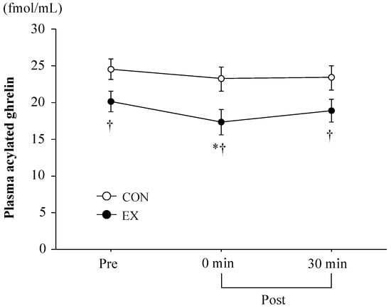 Change in plasma acylated ghrelin concentrations. Values are means ± SE. * p < 0.05 vs. pre, † p < 0.05 vs. CON.