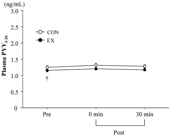 Figure 2 shows the time-course change of plasma PYY3-36 concentrations. Two-way ANOVA revealed a significant main effect of the trial for plasma PYY3-36 concentration. Although plasma PYY3-36 concentrations at baseline were significantly lower in EX than in CON (p < 0.05), there was no significant difference between the trials after exercise. Furthermore, plasma PYY3-36 concentration did not change significantly from baseline values in either EX or CON.
