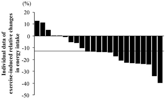 Individual data of exercise-induced relative change in energy intake. The line indicates the average value of relative change in exercise-induced energy intake (−12.9% ± 2.8%).