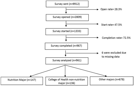 College students, ages 18–25, enrolled for spring 2014 term at a public university in Florida, United States were recruited through campus email. The email was sent out by the Academic Affair of the university via the Qualtrics email system to all college students aged 18–25 years old. If students agreed to participate, by clicking on the individual link in the email announcement, they will be instructed to complete informed consent and the survey through Qualtrics system. They were also instructed to print a copy of the consent document for their records. The survey link was active for two weeks from the date sent. To encourage nutrition major students to participate, faculty in the department of Nutrition and Dietetics were encouraged to reward bonus points for student participation. No other type of incentive was given to participants. Among 9912 college students to which questionnaires were sent, 967 respondents finished all questionnaires (response rate 9.8%). Six respondents were excluded from analysis due to incompleteness of questionnaires. Final respondents included in the analysis were 961 participants. Figure 1 provides details on response rate.