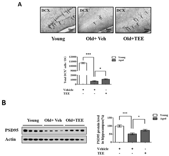 3.3. Oral TEE Supplement Increased DCX+ Cells and PSD95 Protein Expression in Aged Mice