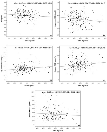 Bivariate correlations between BMI and blood Hb concentration, and between BMI and biochemical parameters of micronutrient status are shown in Figure 1. BMI showed only small-sized correlations with Hb, serum FER, serum sTfR and serum RBP concentrations. BMI was negatively correlated with serum FER (rho = −0.144, p = 0.034, BCa 95% CI = −0.271, −0.015) and positively correlated with serum RBP (rho = 0.180, p = 0.008, BCa 95% CI = 0.050, 0.305). However, the relationships between BMI and Hb (rho = −0.125, p = 0.066, BCa 95% CI = −0.255, 0.016) and between BMI and serum sTFR (rho = 0.126, p = 0.064, BCa 95% CI = −0.020, 0.259) were not significant. No relationship between BMI and serum VitB12 was found (rho = −0.027; p = 0.697, BCa 95% CI = −0.164, 0.110).